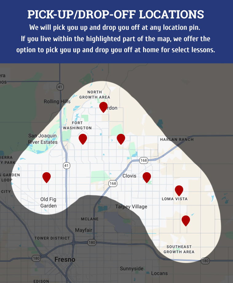 - Five 2-hour lessons with a qualified instructor in Clovis/Fresno (10 hours total)